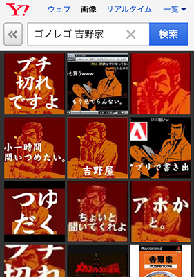 吉野家コピペのフラッシュアニメ化が話題になった「ゴノレゴ 吉野家」を画像検索。当時のフラッシュアニメ流行のきっかけとなり、2006年には「日本のメディア芸術100選」に選ばれている